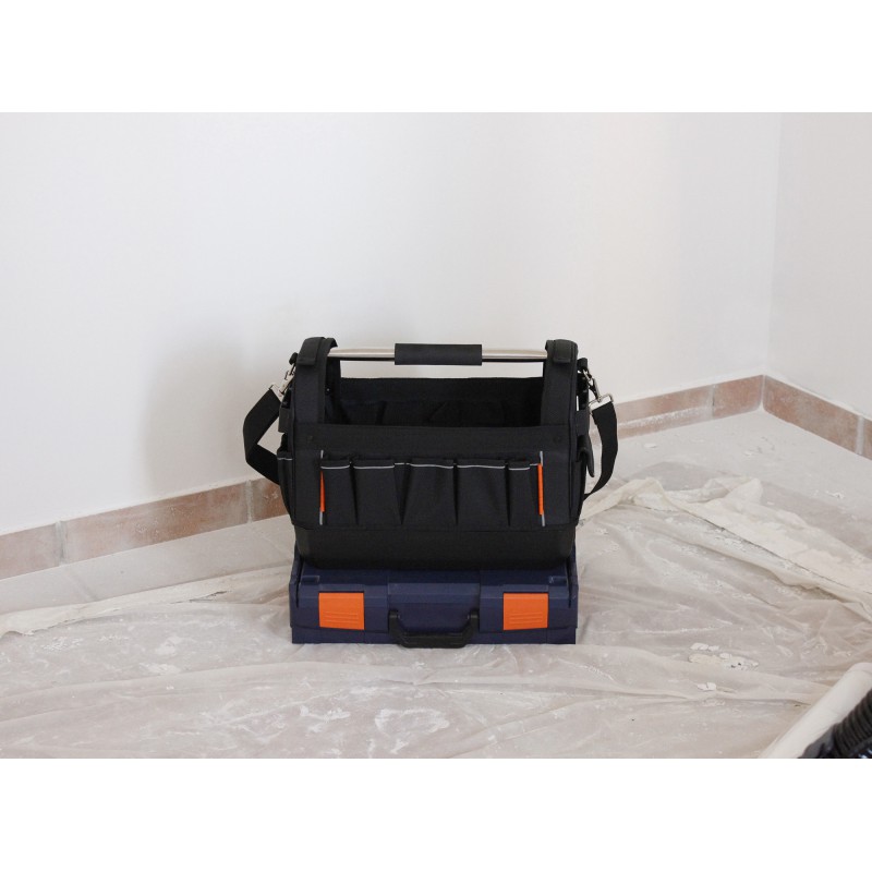 Grâce à ses clips de verrouillage, la sacoche peut s’empiler sur l’EDMABOX (ou autre L-Boxx) afin d’optimiser le transport des outils.